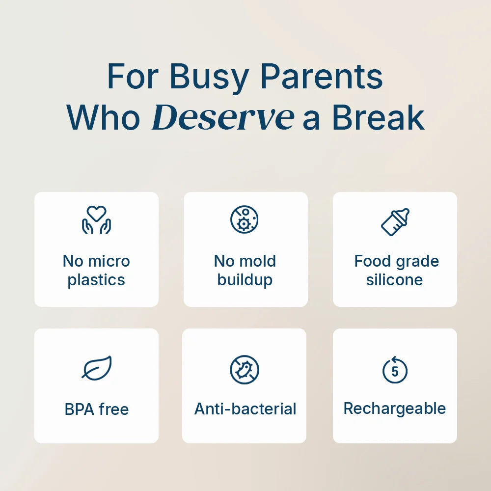 “I’ve been using this for almost a month, and I’m genuinely impressed. The battery lasts a long time, and the different brush heads are perfect for bottles, nipples, and pump parts. It’s durable, easy to use, and one of the few baby tools I actually rely on daily.”